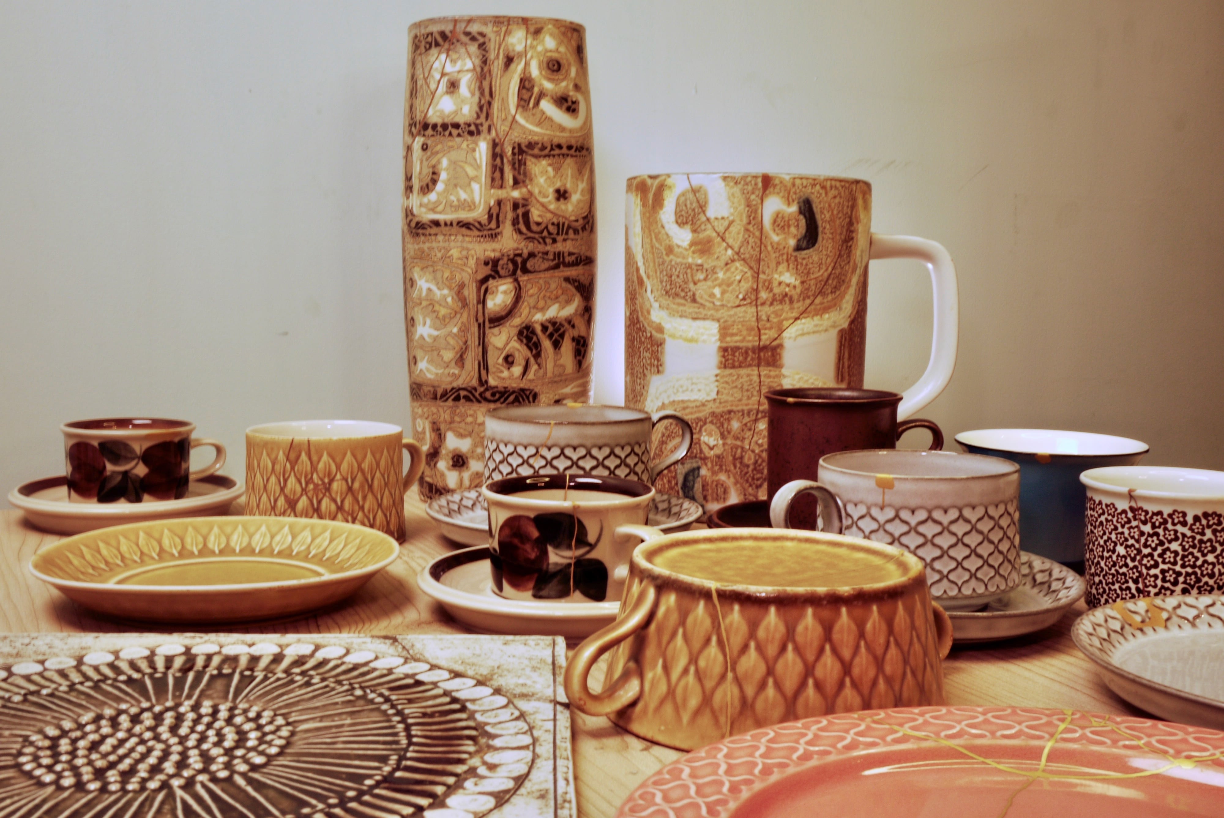 欠けたり割れたりした器を、天然漆で接着し、金粉・銀粉・錫粉などで仕上げます。